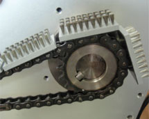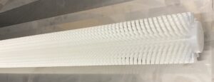 チャンネルロールブラシ(2周ヒネリ) 指定ピッチの間で、ヒネリ角度を指定します。 なだらかに、清掃対象物を払い出す事ができます。 |