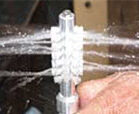放水ブラシ(グリス塗布・接着剤と腑等) ブラシ軸より、スプレー水やエアーを放出しながら、ブラッシングを行う事ができます。他には、グリス塗布、接着剤塗布など目的にあわせて、製作可能です。 |