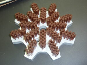 凹型ブラシ(組合せ式ブラシ) 通常では植毛出来ない形を数種類のブラシを組合せ一体型にする事により、複雑な形状のワークに対して、狙った箇所を1回でブラッシングする事が出来ます。通常では、植毛できない形状の為、数種類に分割したブラシを組み合わせて、使用します。 |