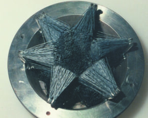 植込ロールブラシ(パイプ) 樹脂台に、ナイロンを植毛 ガラス表面の洗浄用途で使用しています。最小線径は、Φ0.06~です。 |