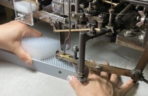 毛材の折り込み穴と、縫い取り引き込みの2段穴加工を使用します。縫い取る線材は通常、ステンレス線を使用しています。 |