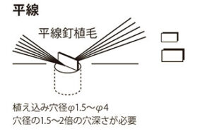 植込みブラシの毛材が抜 けない様に平線で打込固 定を行います。 植込み台が薄く小径穴の 植え方です。 |