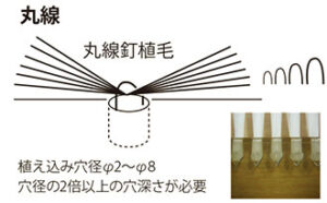 植込みブラシの毛材が抜 けない様に丸線を打込固 定を行います。平線より 穴が深く釘を深く打ち込 みますので平線より抜け にくくなっています。 |