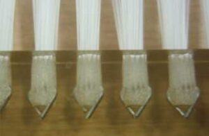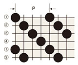 | 並列植えは平面の板状に多い植え方で、植毛穴の並び方が縦横に規則正しく並んでいます。ロールブラシは毛材間に隙間ができ、毛の当たらない部分がございます。搬送ローラーなどに向いています。 | 千鳥植えは並列植えよりも毛材密度が高いブラシができます。 | |