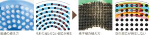 格子植えでは規則よく配列されたブラシ毛材が回転することにより、各々のブラッシング部位が重なり、空白部位が発生しません。