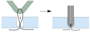 | 平線・丸線 植込み穴に毛材は二つ折りに押し込められ、毛材が抜けないようにメッキ線やステンレスの平線(丸線)で止めます。 |
