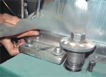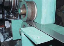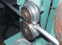 | 平板コイル材がCH成型機で∪字型のチャンネル(CH)を成型します。 | チャンネル材に挿入した毛材を、芯線で固定します。毛材が二つ折れになり直線ブラシができます。 | |