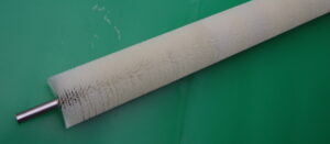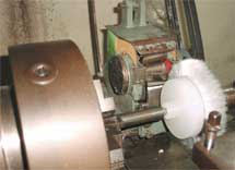 | 直線ブラシを、巻取り旋盤でブラシ軸に 巻きつけてロールブラシを製作します。 (ロールの場合) |