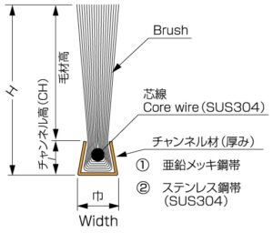 チャンネル(CH)と呼ばれる、凵字型の金属にブラシ毛材を二つ折れにし、芯線で抑え込み、チャンネル上部をすぼめて毛材を抜けないようにしてあります。 |