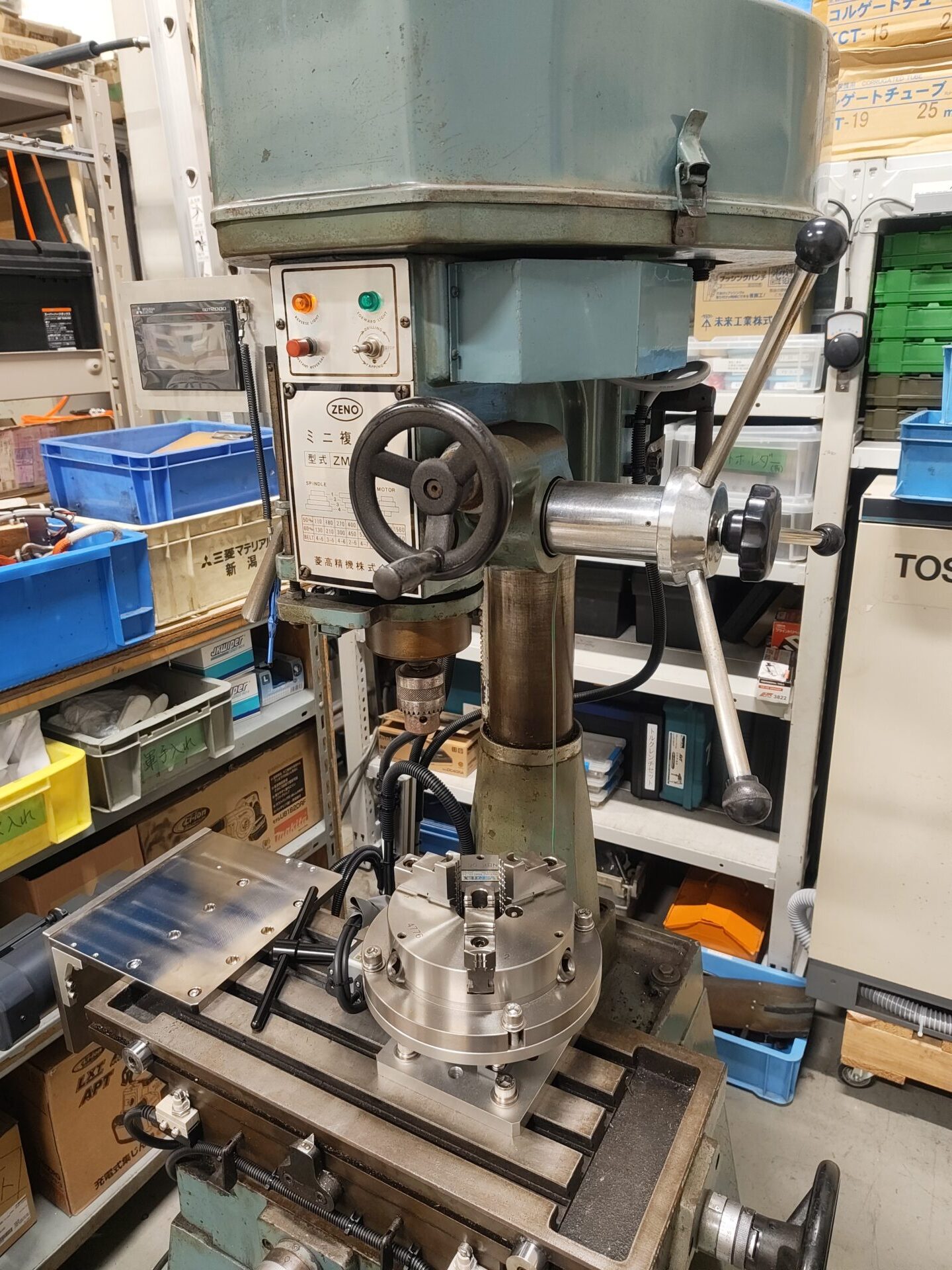 卓上ボール盤+ 回転チャック治具小型ワークのバリ取り・洗浄テストに使用する汎用機。 |