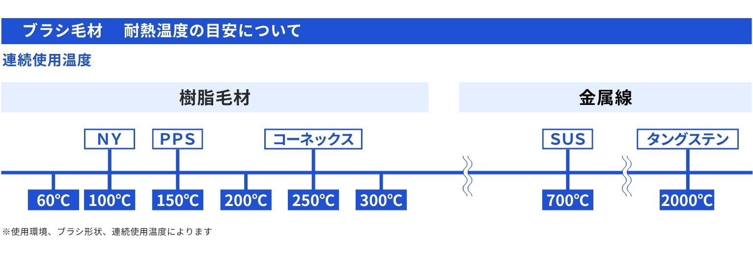 メタ系アラミド繊維 コーネックス(比重1.34)コーネックスは消防服や航空機内装材など広く使用されている超難燃性アラミド繊維をブラシ用毛材に開発したものです。コーネックスは空気中で溶融することなく、400℃ではじめて分解、炭化を開始する耐熱性と限界酸素指数(LOI値)29以上という防炎性・難燃性を持つ繊維です。