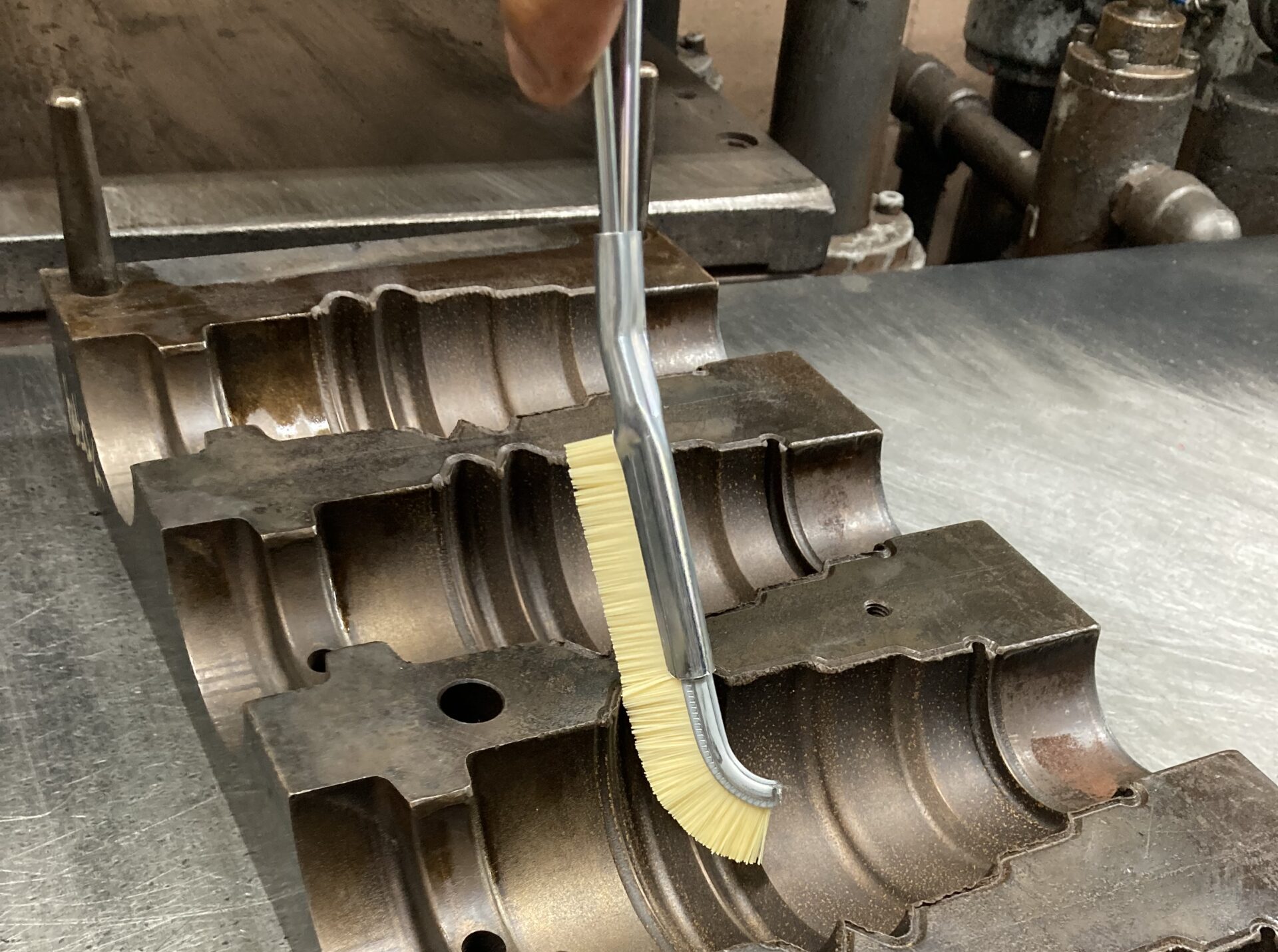 下記ブラシは、耐熱毛材を使用しており、金型が高温状態のまま、清掃を開始することができます。清掃を終え次第金型をセット、すぐに成形加工に取り組めます。また従来、工業用ブラシでよく使用される、金属線とは異なり耐熱樹脂毛材(~250℃)を使用しており、金型へのダメージを加え、メンテナンスをすることが可能です。
