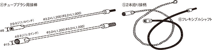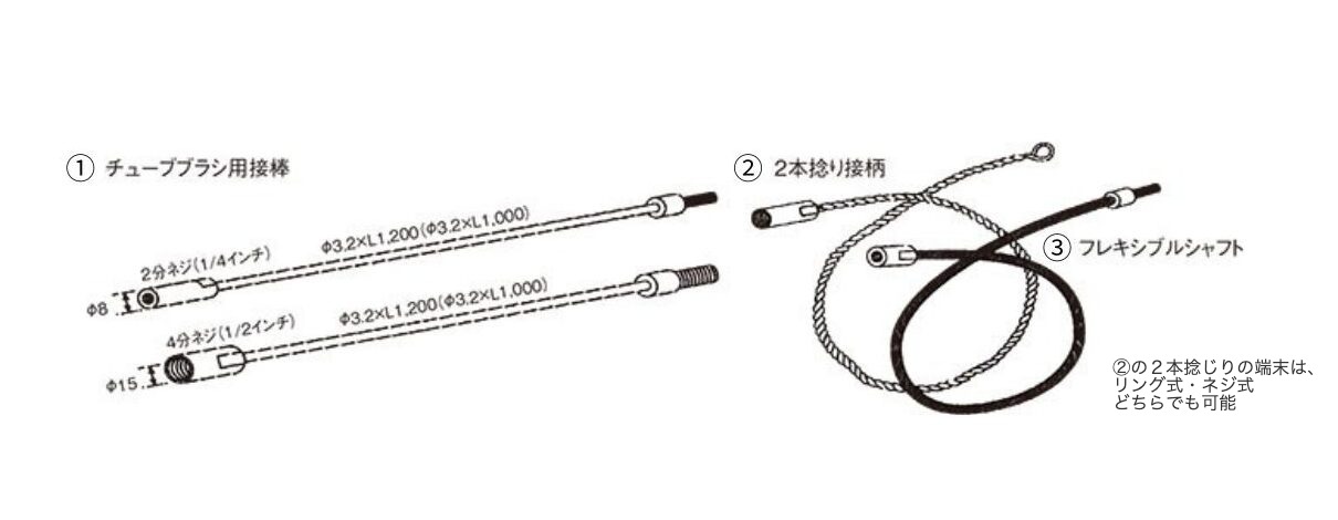 (¼インチネジ)469502 ① チューブブラシ用接棒 L1000 469002 L1200 469099 ② 2本捻り接柄 L1000 L2000 469106 ③ フレキシブルシャフト L1000 L2000 コード 商品名 サイズ 4分ネジ