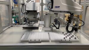 トレイのワークをスカラロボットが取り出しブラシバリ取りユニットにてバリを除去後、再度トレイに収納する収納機能付きバリ取り装置です。トレイのワークを差し替えるとバリ取りを自動で行い収納します。 |