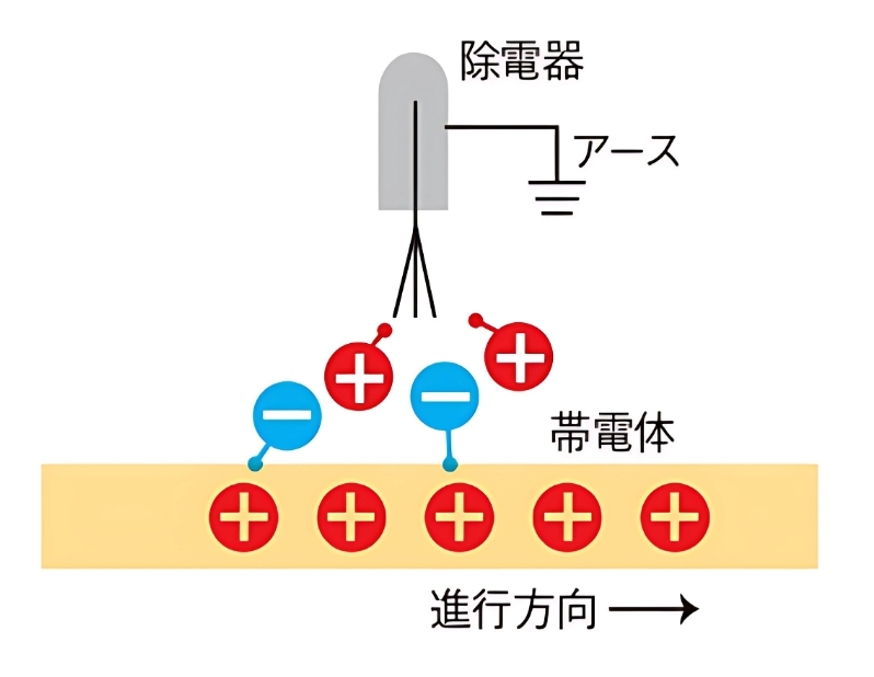 接地したサンダーロン繊維の先端に帯電物体の電界を集中させコロナ放電を電離し、ポジティブ(+)、ネガティブ(-)のイオンを生成し、静電気帯電を除去します。除電効果は帯電物体の電位と距離に影響し、帯電が大きいほど速やかな除電効果を発揮します。