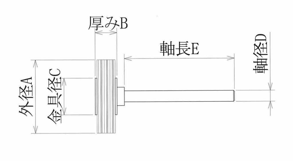 1 コード 商品名 毛材 外径A 厚みB 金具径C 軸径D 軸長E ① 574010 軸付