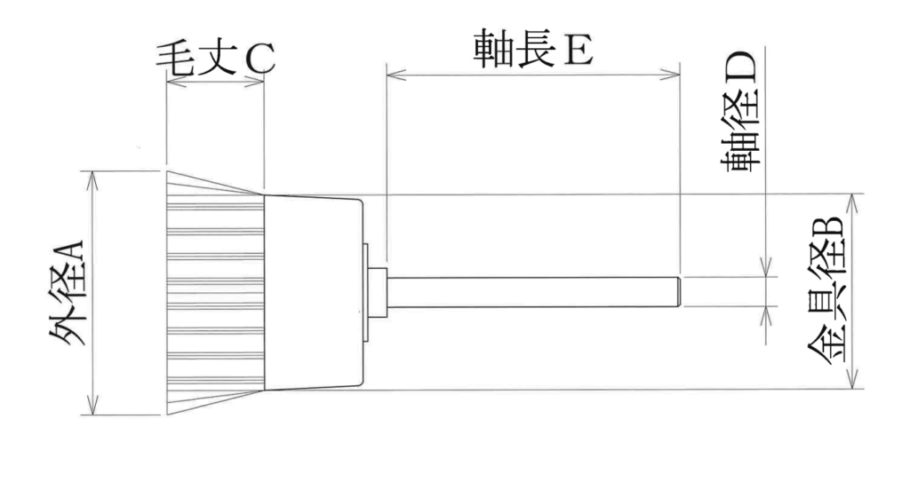 1 コード 商品名 毛材 外径A 金具径B 毛丈C 軸径D 軸長E ① 575013 軸付