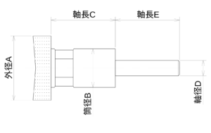 コード 商品名 毛材 外径A 筒径B 筒長C 軸径D 軸長E 線径 ① 570025 平型