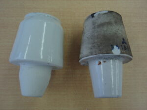 (右)使用済みの汚れた碍子